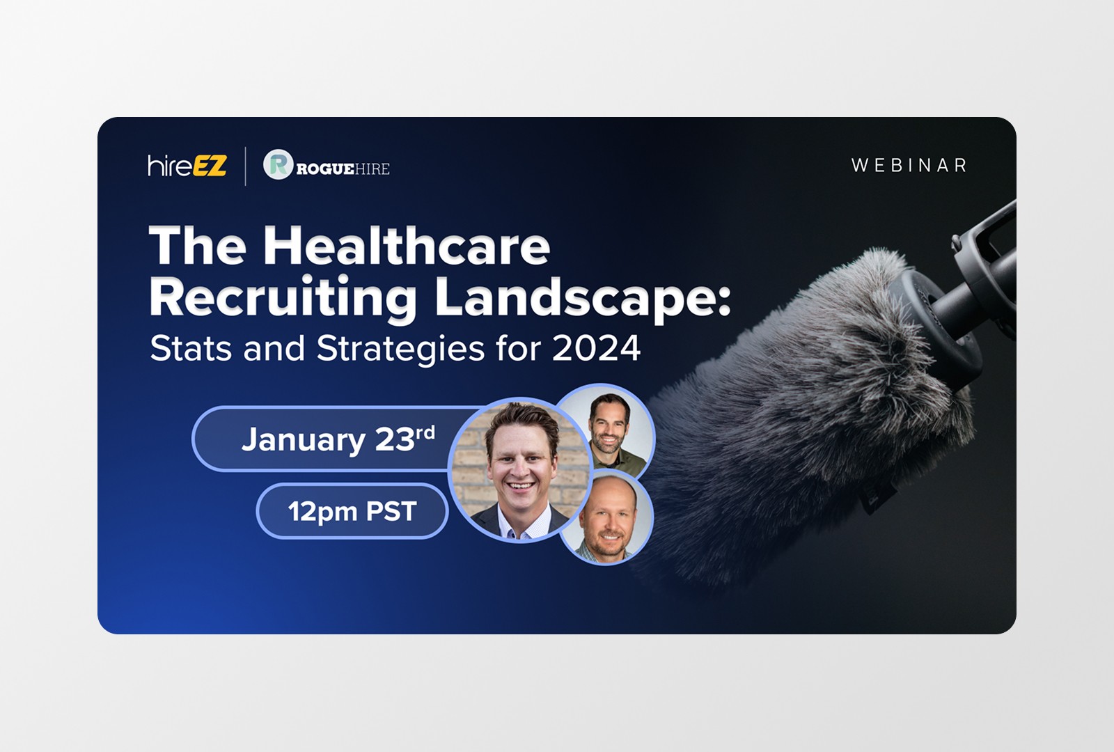 The webinar thumbnail was a graphic used on monthly basis to promote new speakers for HireEZ's webinar on the state of affairs in the talent acquisition space. Lapis blue paired with charcoal gray to offer stark contrast to HireEZ's logo, and allow the speaker photos to spotlight. Photography of a microphone to quickly understand the purpose of this thumbnail leading to the speakers portraits.